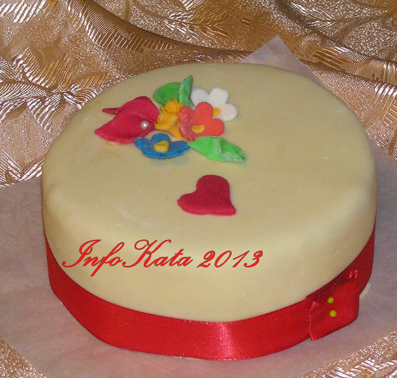Kihűlés után 4 lapba vágtam, felforrósított baracklekvárral kentem a lapokat, majd kívül is bevontam a tortát. A fondantot felmelegítettem, a tortát bevontam vele és díszítettem.